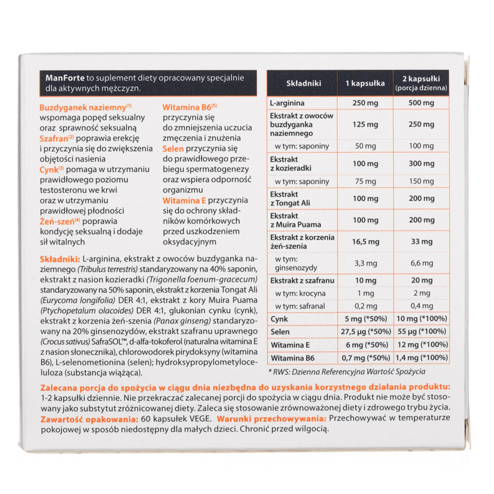 ManForte dietary supplement contains a large portion of L-arginine, mace extract - which supports sexual desire and performance, ginseng extract - which helps maintain optimal stamina, vitality and physical and mental well-being. The new ManForte formula is also enriched with fenugreek extract and saffron extract - which improves erection and contributes to increased semen volume.