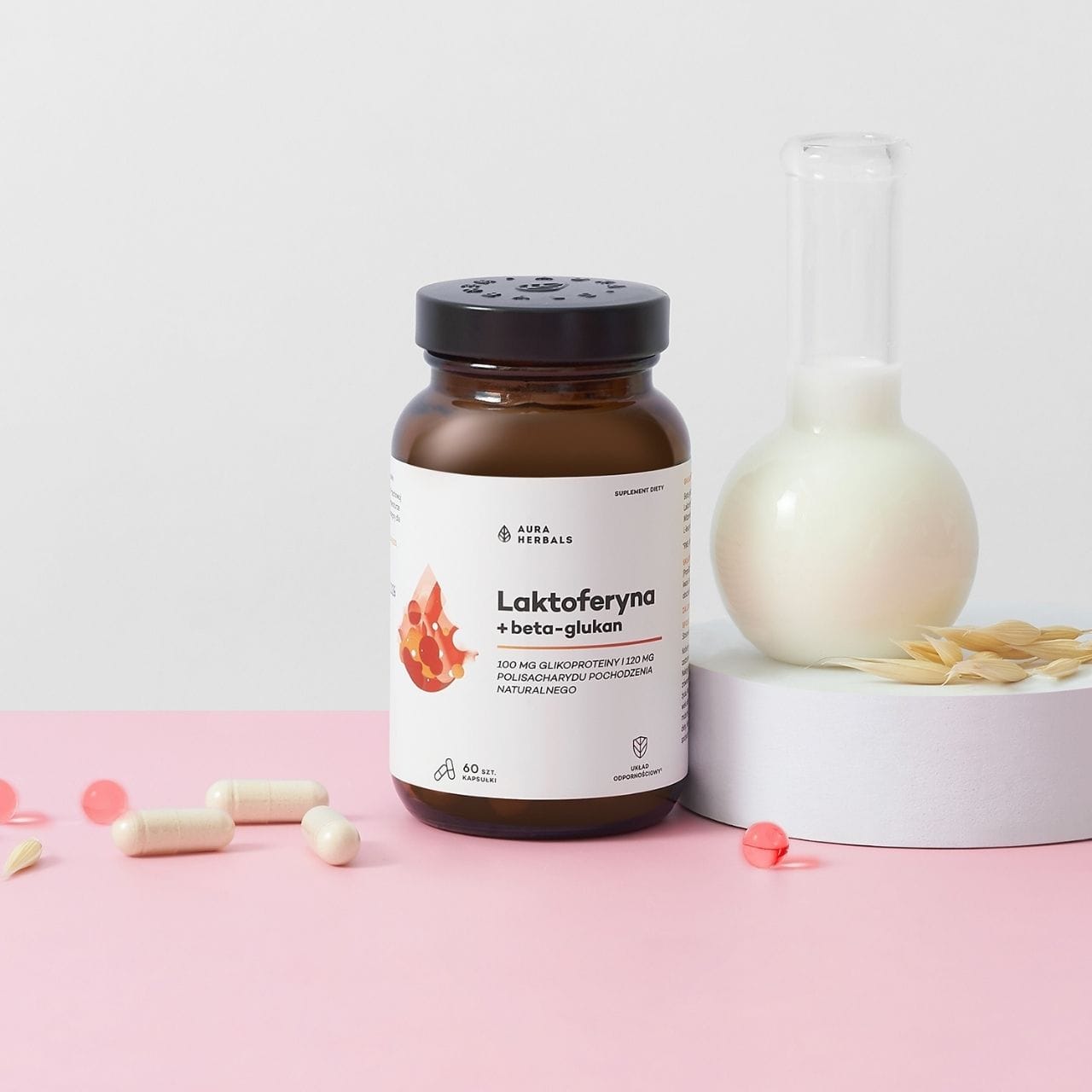 Aura Herbals Lactoferrin + Beta-Glucan is a dietary supplement in vegetarian capsules containing PromOat® beta-glucan from oats (120 mg), lactoferrin from milk (100 mg), and vitamin C (40 mg = 50% RDA). Vitamin C contributes to the normal functioning of the immune system. The product is in line with the clean label concept – no artificial colors or preservatives. HPMC capsule. Pack of 60 capsules = 60 days of use. Contains milk and oats.