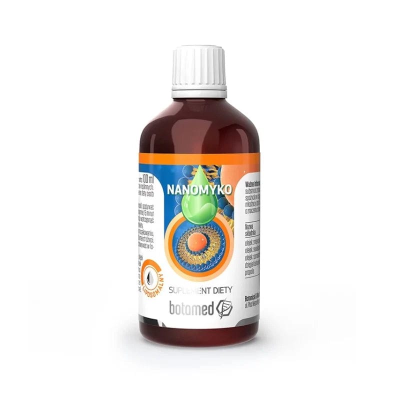 Nanomyko is a liquid dietary supplement containing a composition of herbs and plant extracts, which are a source of many valuable micronutrients, nutrients, flavonoids and antioxidants. The composition of herbs and plant oils encapsulated in lipid microscopic capsules, formed by liposomization from soy lecithin. The formulation uses synergistic action, giving immune support. It also supports many of the body's natural physiological processes, which are responsible for detoxification pathways and maintenance of normal bacterial microflora.