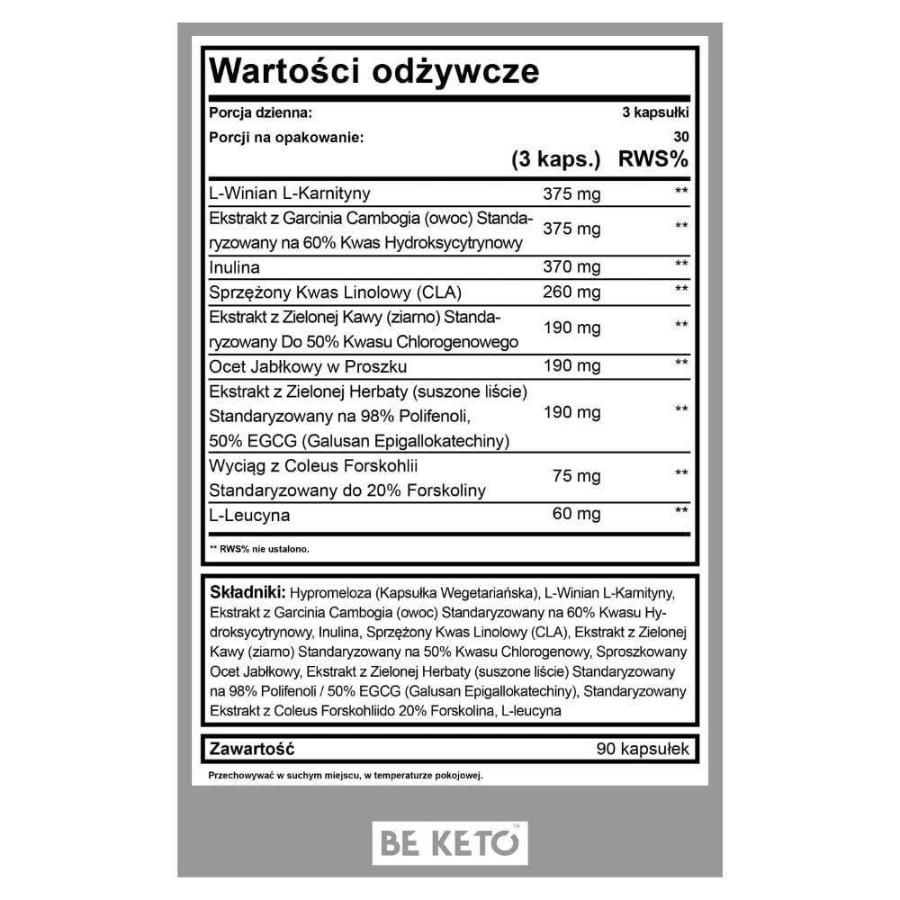 BeKeto Keto Burn is a dietary supplement in capsule form. It contains a combination of ingredients such as L-carnitine L-tartrate, Garcinia cambogia extract, inulin, CLA, green coffee extract, green tea extract and forskolin.