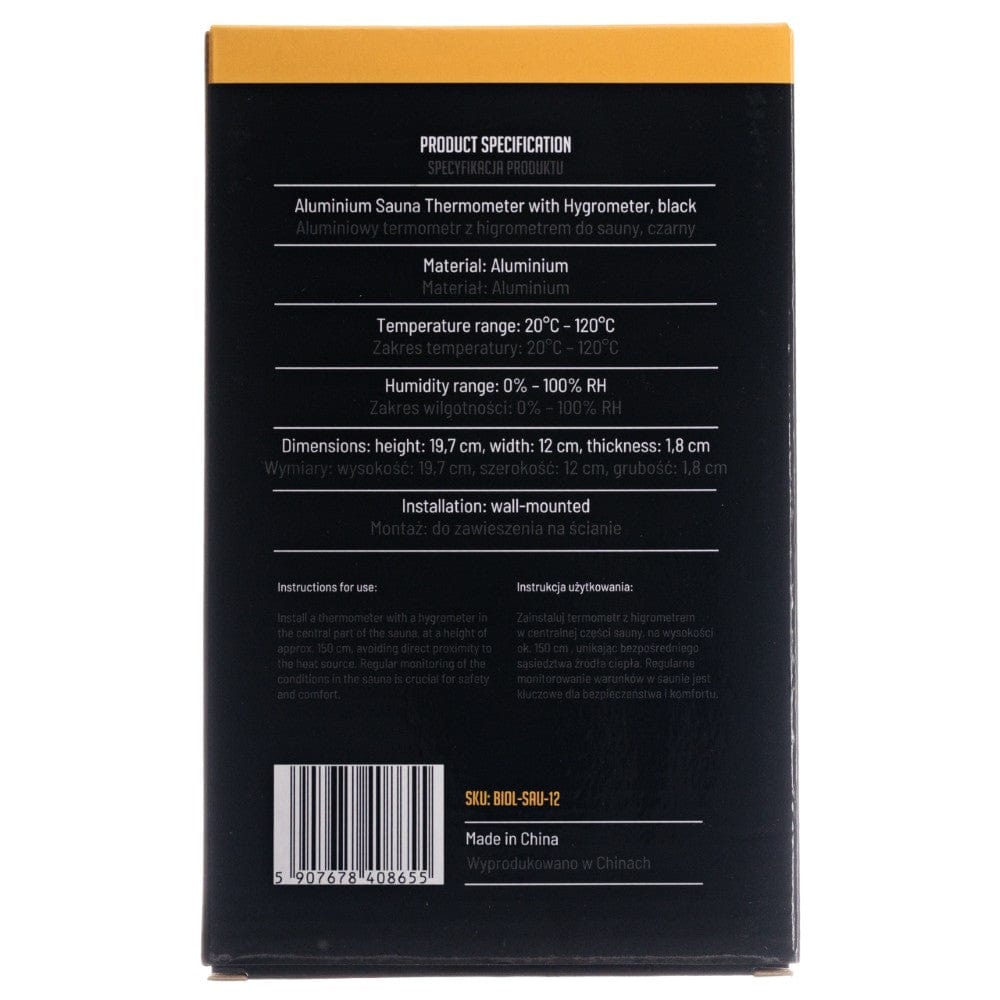 The Bilovit Sauna Thermometer and Hygrometer is a precise measuring device made of durable black aluminium. It enables accurate measurement of temperature in the range from 20°C to 120°C and humidity from 0% to 100%, ensuring optimal sauna conditions. Its elegant design and solid construction make it the perfect accessory for any sauna.