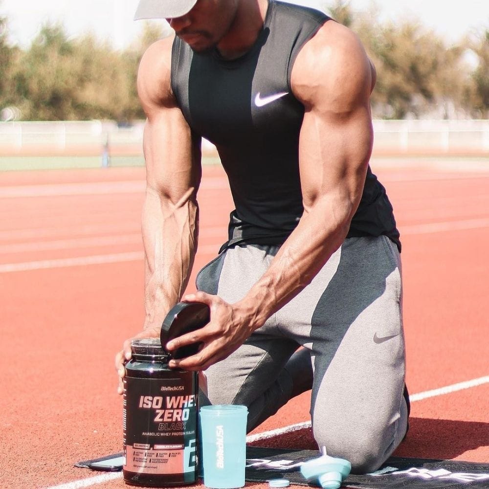 A drink powder based on whey isolate with a protein content of 90 per cent, with added creatine, amino acids, zinc chelate and vitamin B3.
