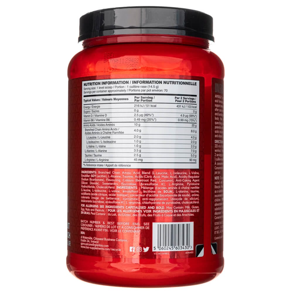 Branched amino acid blend (L-leucine, L-isoleucine, L-valine, emulsifier; Soy lecithin, L-alanine, taurine, acids (Citric acid, malic acid), acidity regulator (Sodium bicarbonate), flavors, anti-caking agents (Calcium silicate, Silicon dioxide), barley malt extract [gluten], sweeteners (sucralose, acesulfame K), pyrodoxine hydrochloride, L-arginine, cholecalciferol.