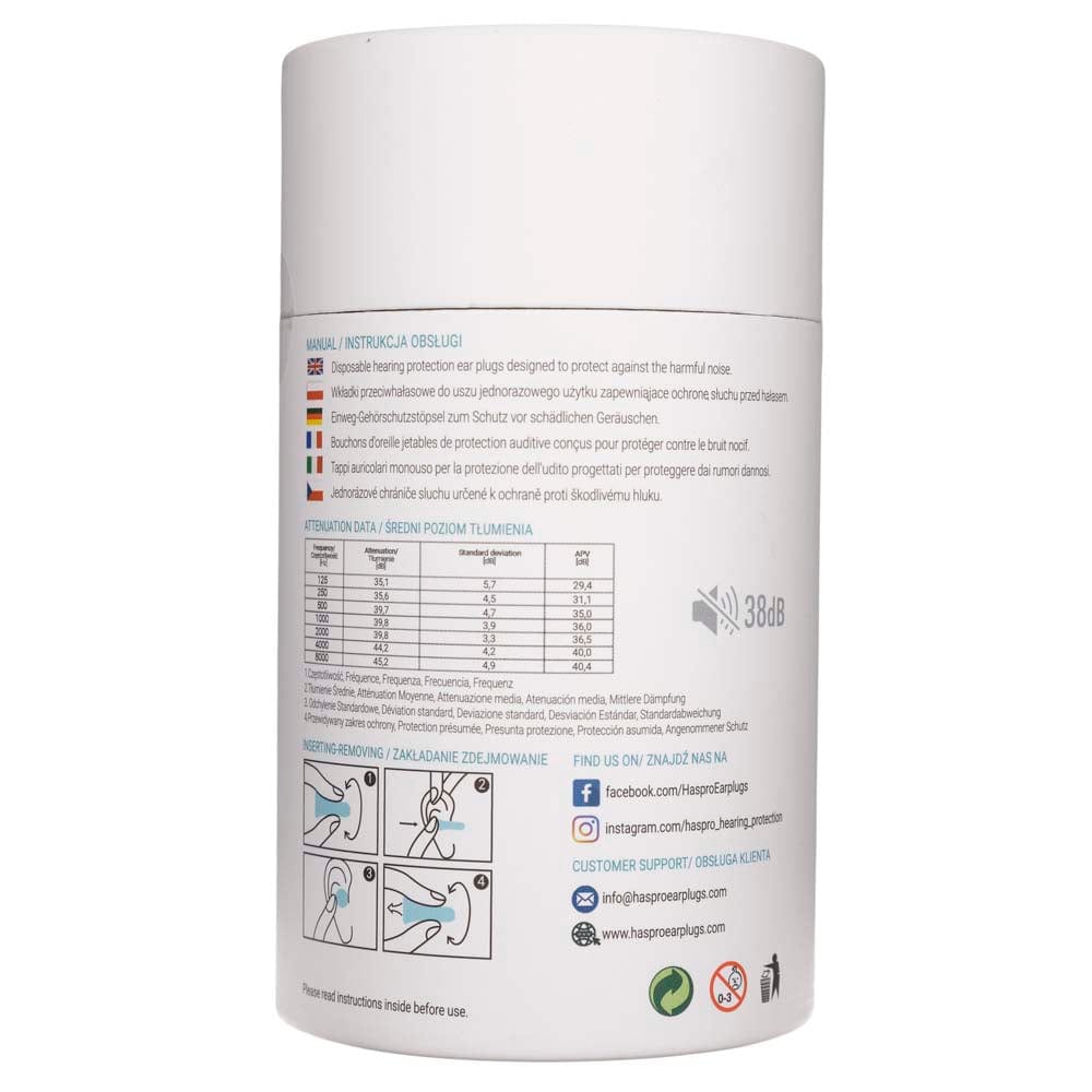 The HASPRO TUBE50 earplugs are a product that contains 50 pairs of foam earplugs made of super soft polyurethane foam with a high attenuation ratio of 38 dB. As a result, they provide an optimal fit for each ear canal and one of the highest attenuation levels in their category. They are designed to protect against excessive noise, which often causes immense discomfort and in some cases headaches.
