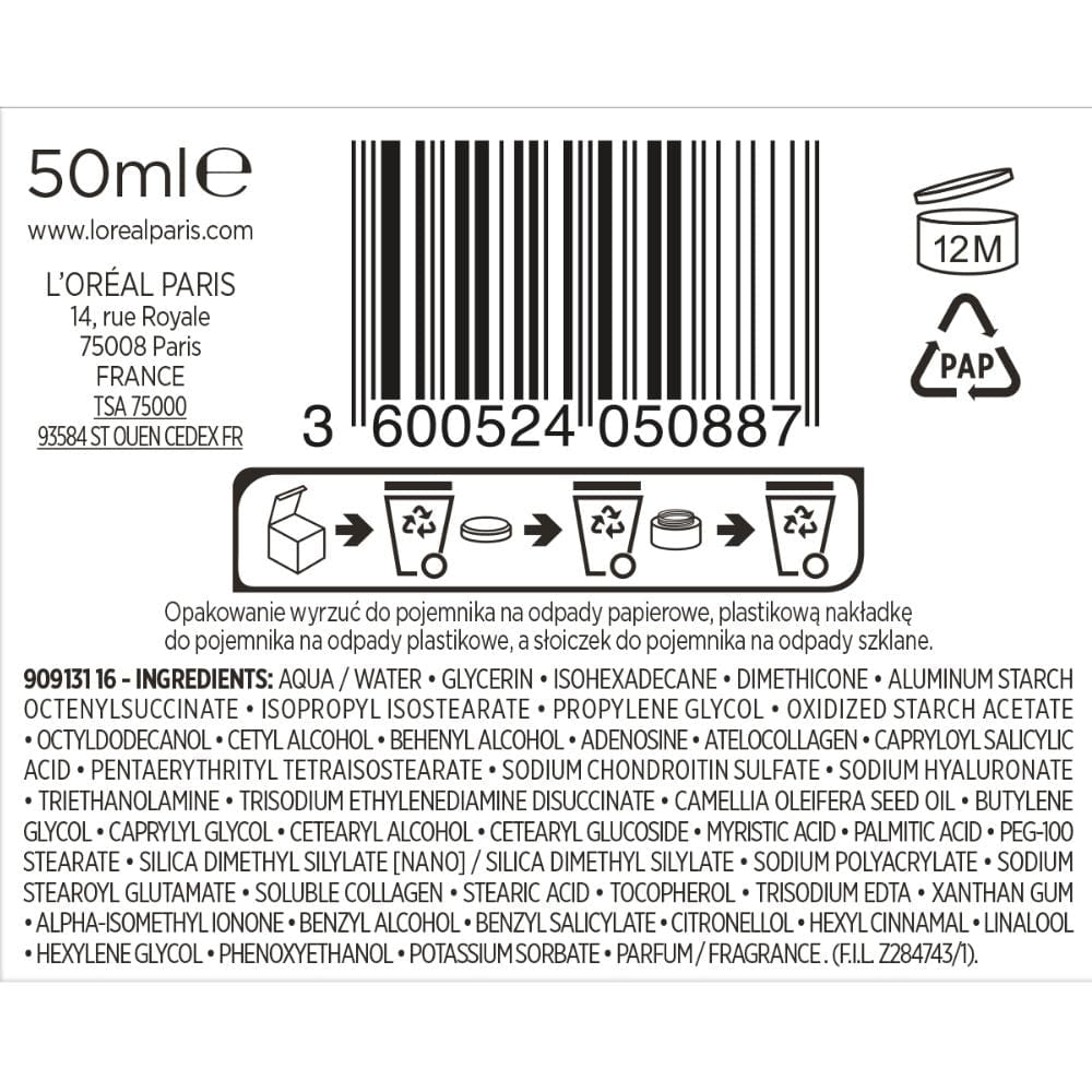 Aqua, Glycerin, Isohexadecane, Dimethicone, Aluminum starch octenylsuccinate, Isopropyl isostearate, Propylene glycol, Oxidized starch acetate, Octyldodecanol, Cetyl alcohol, Behenyl alcohol, Adenosine, Atelocollagen, Capryloyl salicylic acid, Pentaerythrityl tetraisostearate, Sodium chondroitin sulfate, Sodium hyaluronate, Triethanolamine, Trisodium ethylenediamine disuccinate, Camellia oleifera seed oil, Butylene glycol, Caprylyl glycol, Cetearyl alcohol, Cetearyl glucoside, Myristic acid, Palmitic acid, Peg-100 stearate, Silica dimethyl silylate [nano], Sodium polyacrylate, Sodium stearoyl glutamate, Soluble collagen, Stearic acid, Tocopherol, Trisodium edta, Xanthan gum, Alpha-isomethyl ionone, Benzyl alcohol, Benzyl salicylate, Citronellol, Hexyl cinnamal, Linalool, Hexylene glycol, Phenoxyethanol, Potassium sorbate, Parfum.