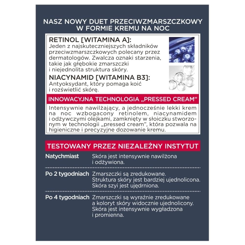L'Oréal Paris Revitalift Laser Retinol and Niacinamide Night Cream is an innovative product created for comprehensive anti-ageing care. Its advanced formula combines the power of two key active ingredients, retinol and niacinamide, to effectively fight the signs of skin ageing.