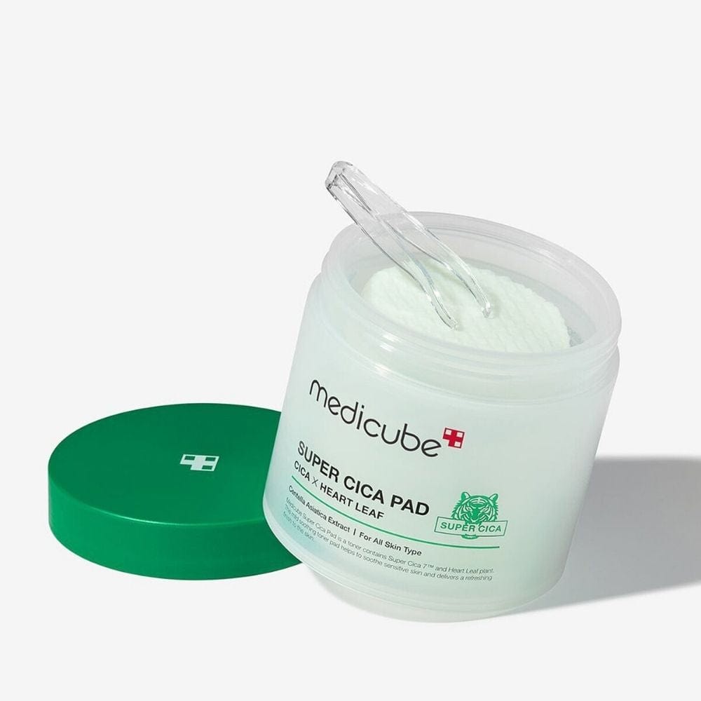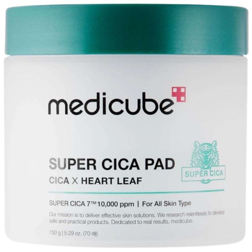 Medicube Super Cica Pad Cica Heart Leaf is a double-sided exfoliating and soothing pad with centella asiatica extract and its active compounds (asiatic acid, madecassic acid, asiaticoside, madecassoside). Thanks to the innovative formula, the flakes effectively soothe irritations, reduce inflammation and relieve redness, while gently exfoliating dead skin cells thanks to salicylic acid. The dual functionality (perforated side for exfoliation, smooth side for soothing) makes the product ideal for all skin types that need soothing and refreshing.