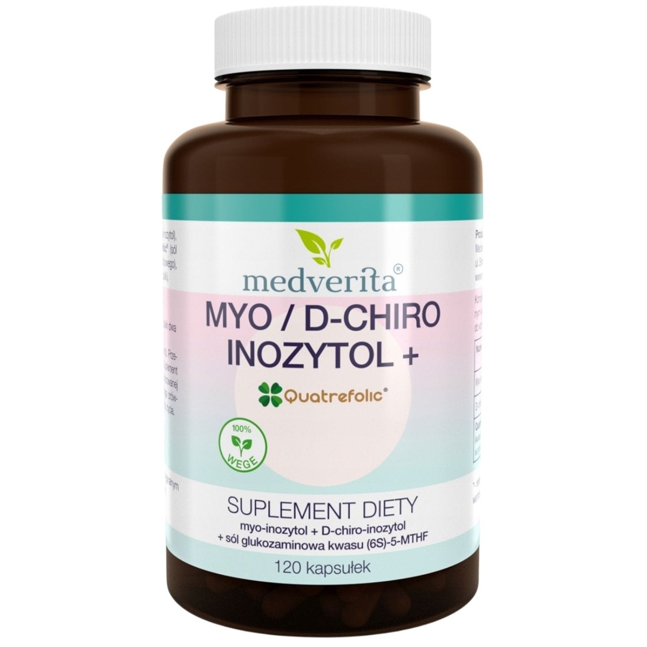 Medverita Myo/D-chiro inositol + Quatrefolic® is a dietary supplement in capsule form. A complex of Myo and D-chiro-inositol stereoisomers with active folic acid Quatrefolic®. Inositol is a vitamin-like organic compound that is sometimes referred to as ‘vitamin B8’. Its biologically active form is myo-inositol, found in plant and animal organisms. A supplement without unnecessary additives and fillers, suitable for vegans and vegetarians.