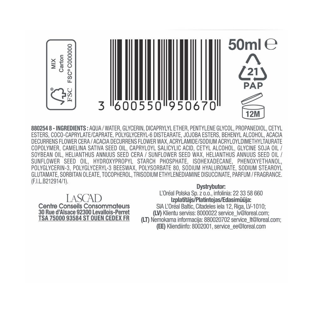 Aqua / Water, Glycerin, Dicaprylyl Ether, Pentylene Glycol, Propanediol, Cetyl Esters, Coco-Caprylate/Caprate, Polyglyceryl-6 Distearate, Jojoba Esters, Behenyl Alcohol, Acacia Decurrens Flower Cera / Acacia Decurrens Flower Wax, Acrylamide/Sodium Acryloyldimethyltaurate Copolymer, Camelina Sativa Seed Oil, Capryloyl Salicylic Acid, Cetyl Alcohol, Glycine Soja Oil / Soybean Oil, Helianthus Annuus Seed Cera / Sunflower Seed Wax, Helianthus Annuus Seed Oil / Sunflower Seed Oil, Hydroxypropyl Starch Phosphate, Isohexadecane, Phenoxyethanol, Polyglycerin-3, Polyglyceryl-3 Beeswax, Polysorbate 80, Sodium Hyaluronate, Sodium Stearoyl Glutamate, Sorbitan Oleate, Tocopherol, Trisodium Ethylenediamine Disuccinate, Parfum / Fragrance.