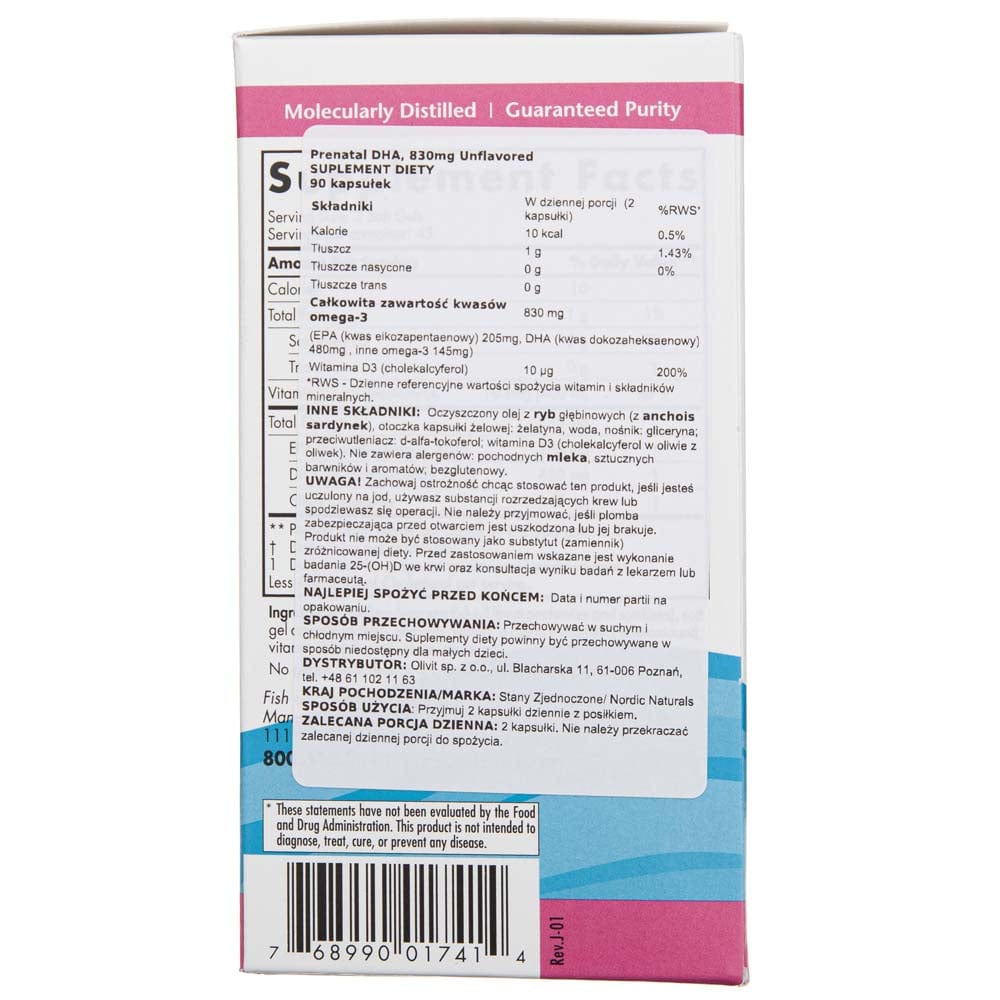 Prenatal DHA Unflavoured from Nordic Naturals is a dietary supplement in tasteless gel capsules containing purified oil from deep-sea fish (anchovies and sardines) and vitamin D.