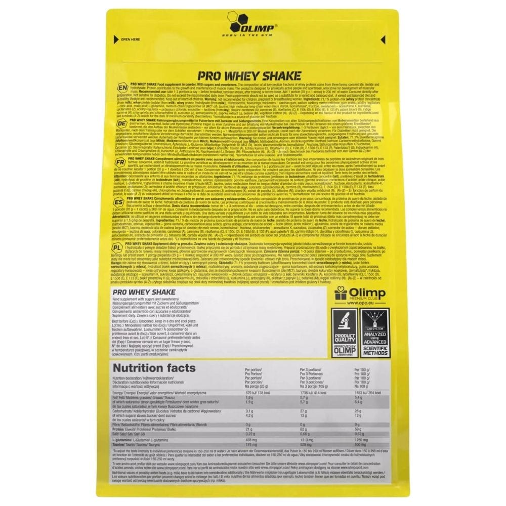Olimp Pro Whey Shake is a powdered dietary supplement. A protein supplement designed for people with an increased protein requirement who are striving to build muscle mass, mainly competitive athletes and recreational exercisers. It combines three sources of protein: whey hydrolysate, isolate and concentrate.