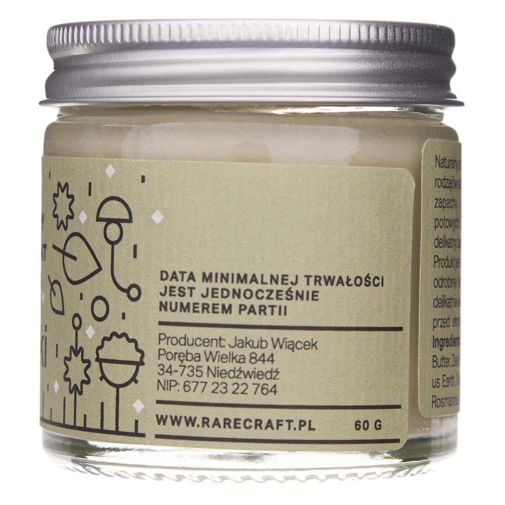 Natural deodorant in cream is another of RareCraft's products. Based on an in-house recipe, the deodorant is a Polish product created in a manufactory near Krakow. The natural ingredients it contains get rid of unpleasant odours and absorb moisture without blocking the sweat glands. Essential oils - lemon and rosemary give a fresh, delicate body fragrance, providing a feeling of comfort throughout the day. Thanks to its light texture, the cream spreads perfectly on the skin.