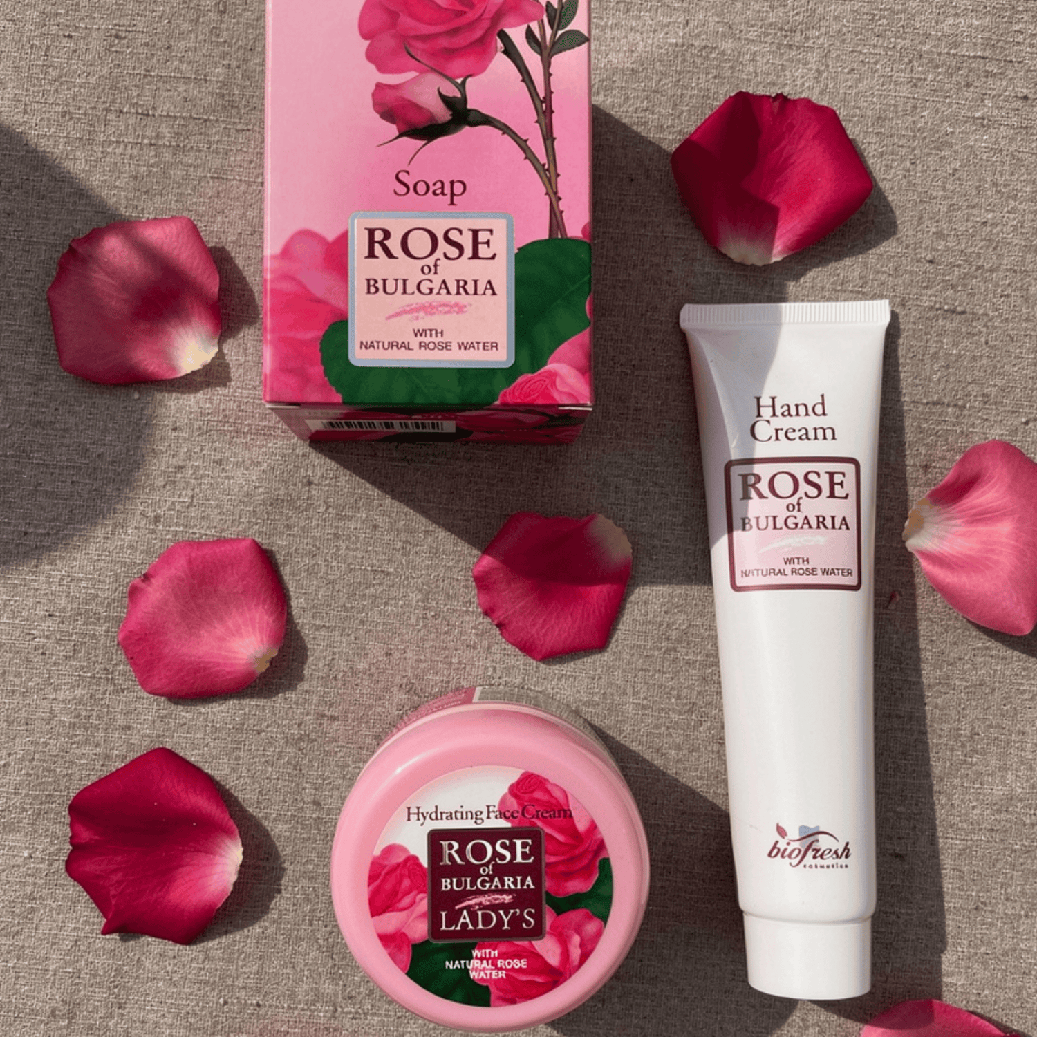• Rose of Bulgaria Soap with Natural Rose Water – 100 g – a gentle cleansing bar enriched with rose water and wheat bran, leaving skin soft, clean and lightly scented.